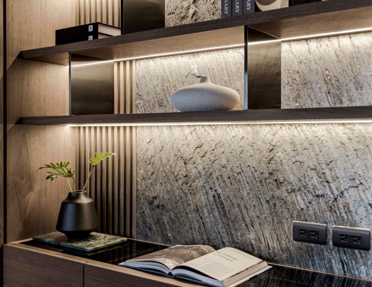 精細的木工搭配著斑駁的牆面讓整個陳列更增添了大自然的生命力,在這一刻我們讓空間跟諾大的落地窗景完全融和了!