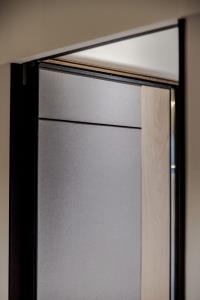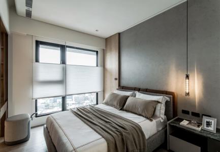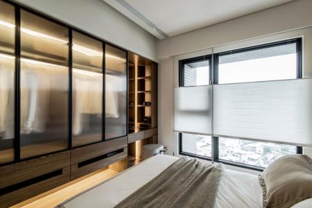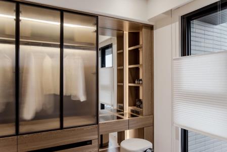 簡單的主臥房,卻帶著些許雅痞風,微透亮的收納,在不失隱私的狀況下卻又帶出精品專櫃的氛圍!
