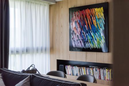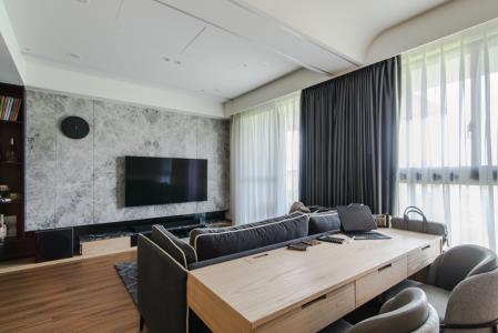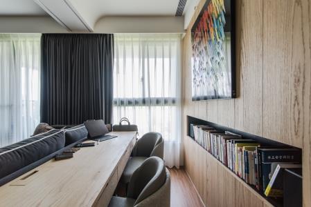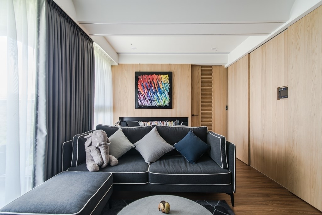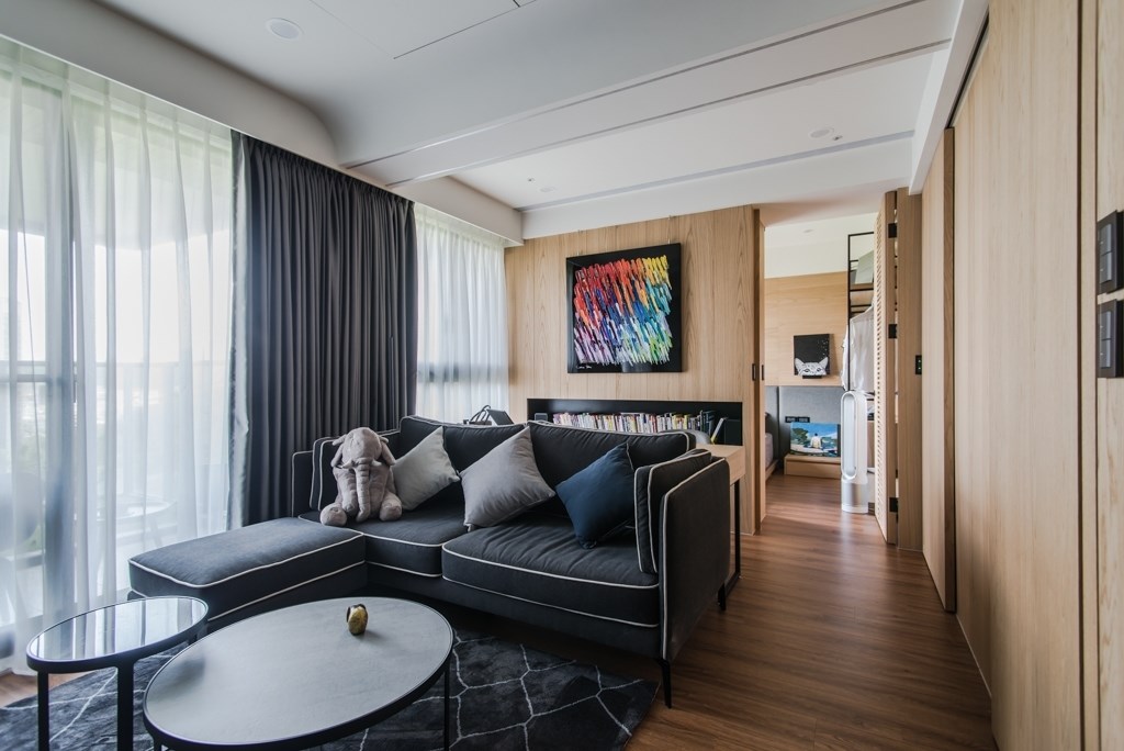 事業有成的青年創業家,用簡約的風格為主軸,並不經意見的展現個人品味,公私領域的簡單隔間,卻搭配了完美的動線,並讓視野充滿了穿透性,我想屋主是希望在這個最舒適的居所,隨時能感受家中貓咪那充滿愛意的眼神吧 ,大量的木紋設計搭配沉穩的家具,讓整個空間維持在三個主色系而不過於繁雜,在這典雅的空間,屋主刻意選擇了色彩繽紛的壁畫,讓整個空間增添了活力,完全展現出屋主工作時沉穩,實則內心隨時充滿活力與想法的個性。