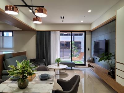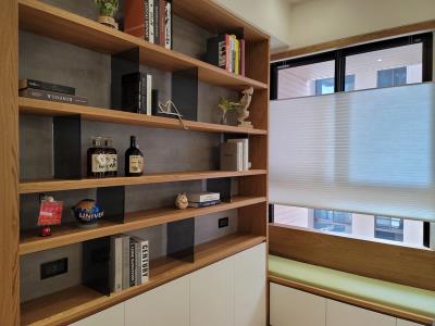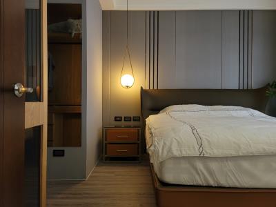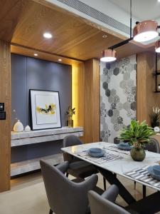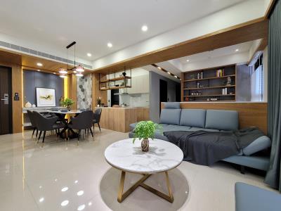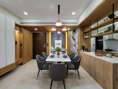 燈光設計極具巧思,嵌入式的筒燈和吊燈相互配合,提供了多層次的照明效果。柔和的光線從天花板流淌而下,給整個空間蒙上一層溫暖的光暈。在這裡,每一個角落都被充分利用,無論是餐桌上的精緻餐具,還是書架上的藝術擺件,都彰顯出主人對生活品質的追求。