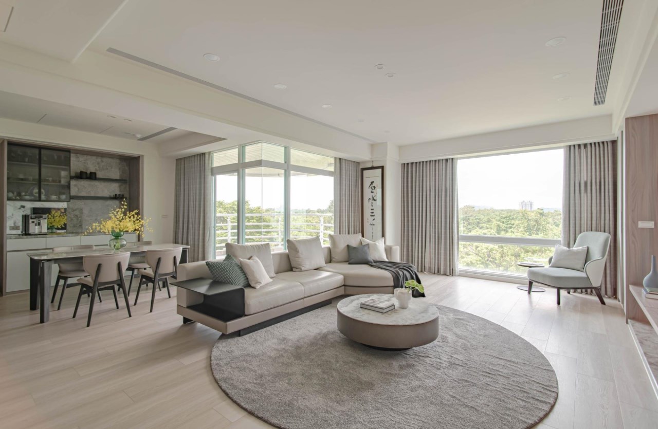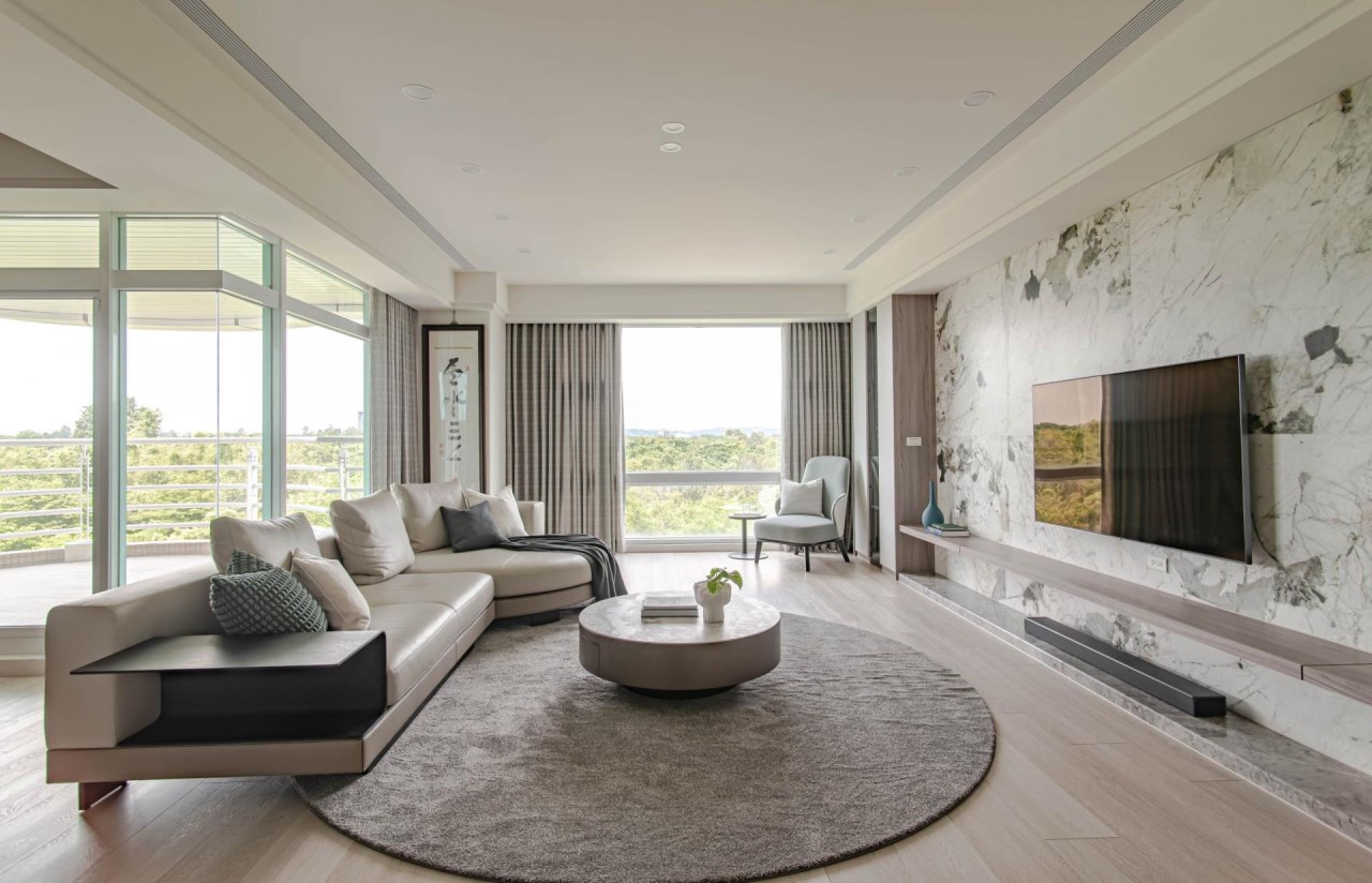 在這個寬敞明亮的客廳中,設計師巧妙地利用了大面積的落地窗,將外界的綠意景觀無縫引入室內,又能毫無切割感。高挑潔白的天花板配合大理石牆面,當你坐在沙發時,雙腳踏立在木質地板,抬頭望向外面的綠景,天空跟我們室內融為一體,在這一刻時間因你而慢了,你更能感受周遭所有的美麗。光線在自然的木質地板上流轉,使整個空間充滿了明亮與通透感。沙發區域選用了高質感的皮革沙發與圓形框架的茶几,既現代又豪華,為居住者提供了舒適的會客空間。