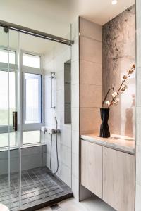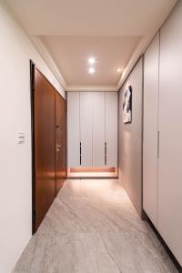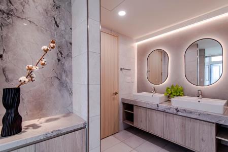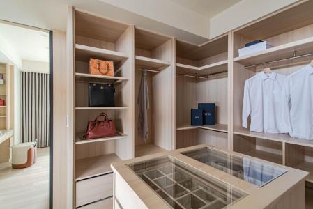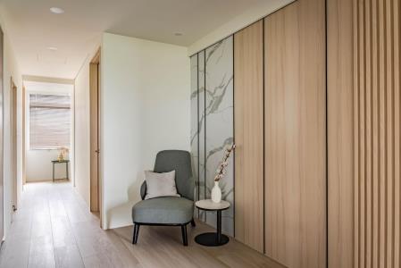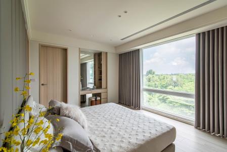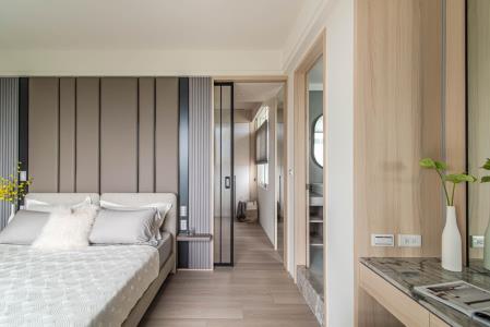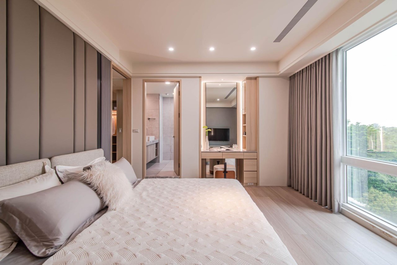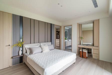 【 主臥的私密綠洲 】 走進主臥,首先映入眼簾的是那個廣大的落地窗,它不僅引進了自然光的溫暖,也將四季變換的景色框入其中。每一次凝視,都像是在欣賞一幅生動的畫作。素雅的梳妝台旁,精品櫃似的衣帽間靜靜地佇立,每一件衣物都有其專屬的位置,彷彿在講述著它們的故事。牆面上的大理石紋路,則是這個空間的靈魂,增添了生命力與張力。
